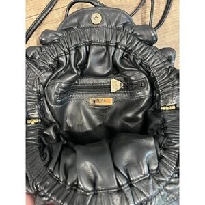 Vintage-style Via Spiga black leather drawstring shoulder bag featuring a ruched design with a faux snakeskin accent at the top. Made from soft, supple genuine leather with gold-tone hardware and magnetic snap closure. The interior includes one zip pocket with a Via Spiga logo pull and tag.
