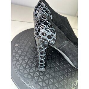 The Via Spiga Black Leather Peep Toe Lace Booties Heels in size 6.5 M are stylish and sophisticated shoes from Cole Haan. These high heels feature a peep toe, lace-up closure, and a suede upper material in a classic black color. The lace accents on the fabric type add a touch of uniqueness to the overall design, making these booties a versatile and chic addition to any woman's shoe collection.