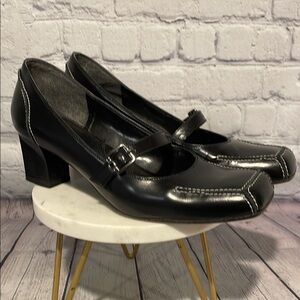 Via Spiga Black Leather Square Toe Mary Jane Heels Sz 7.5