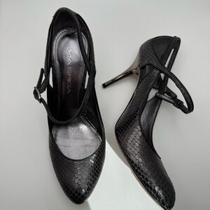 Via Spiga Black Metallic Snakeskin Heels Mary Jane Strap Pumps 3" Stiletto Heels