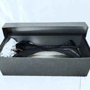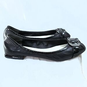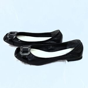 Via Spiga Black Patent Leather Ozzie ballet style peep toe flats, accented with silver double buckle feature. Some light wear to outer soles, uppers in excellent condition. Box included. Size 7 1/2M.