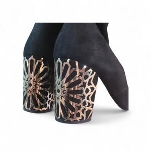 These stunning Via Spiga booties feature a bold gold metallic cutout block heel design that gives them a luxe, architectural look. Made with genuine Italian leather soles (Vero Cuoio), these boots combine elegance with statement style—perfect for evenings out or elevating any outfit.