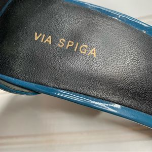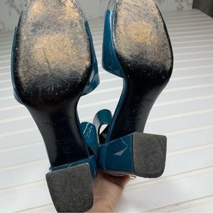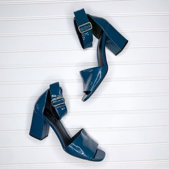 Stylish blue patent leather sandals. Features a chunky heel and adjustable strap. Perfect for any occasion.