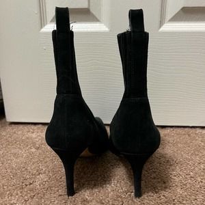 Excellent used condition. Size 7. Leather suede material. Pull on sock boot style. 3.5 in heel. Signs of wear as shown in picture. Very stretchy.