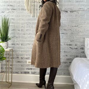 This chic wool day coat from Via Spiga features a classic silhouette in a gorgeous green, grey, and blue woven tweed. It has a point collar with contrast black leather behind the collar, gorgeous seaming, four logo buttons at front, and 4 buttons at the cuff. It is fully lined with a floral satin lining and two side pockets. 88% wool, 12% polyester. Trim: 100% genuine leather Lining: 100% polyester.