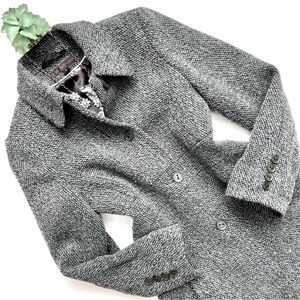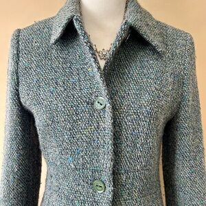 Via Spiga Green Blue Gray Wool Tweed Lady Day Coat Black Leather Trim Size 6
