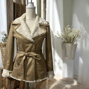 Add a luxe statement to your cold-weather wardrobe with this metallic gold faux leather jacket featuring soft sherpa trim and a flattering belted waist. With its moto-inspired silhouette and cozy lining, this piece balances glam and function effortlessly. Excellent condition – warm, stylish, and unforgettable