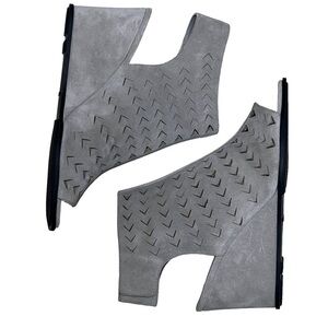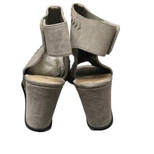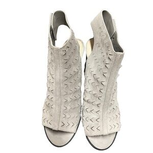 Geometric cutouts add dimensional texture to a dynamic open-toe sandal set on a suede-wrapped wedge that offers a retro-chic finish.