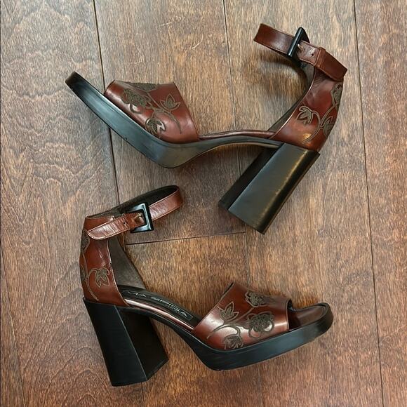 Via Spiga Rare Retro Square Toe Platform Heels, Embroidered Leather, Size 6