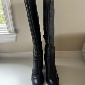 Great condition, Via Spiga tall leather black boots with side zipper. Round toe and block heel. Some wear and tear inside the upper part of the boot shown in pictures. Very comfortable with rubber sole.