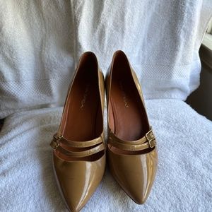 These are used shoes. They are tan patent leather heels with a 2.5 in heel. They are stylish with life still in them.