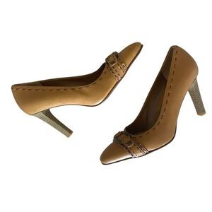 These Italian leather tan neutral heels are by Cia Spiga. The pumps are accented with stitching and a buckle across the top. They are a women’s size 9 M, Italian 56. Fantastic, like new condition! Made in Italy!
