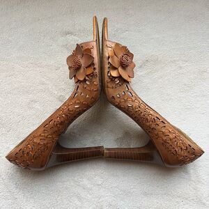 Via Spiga Tan Woven Leather Open Toe Heels Women 8.5 Cut Outs Flower Casual