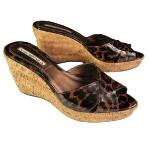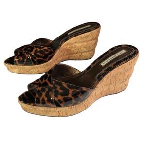 These stunning Via Spiga cork wedge sandals blend bold glamour with timeless sophistication. Crafted in glossy patent leather with a tortoise shell animal print, they feature a crossover vamp, almond peep toe, and easy slip-on mule design. The 1” front platform and 3.5” back wedge add height and comfort while elongating the leg line. Made in Brazil, these luxe wedges pair perfectly with wide-leg jeans, summer dresses, or sleek resort looks for an effortlessly chic vibe. They are in excellent pre owned condition with no flaws.