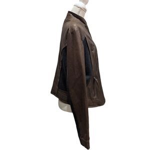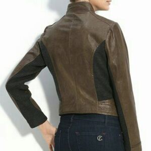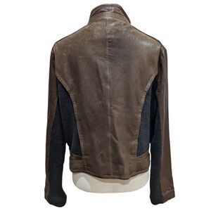 Via Spiga brown military style asymmetrical genuine leather jacket with heather grey wool blend insets on the sides, back & sleeves with a standing collar & off center zipper.