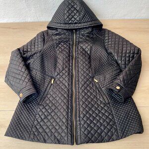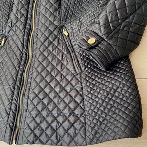 Pre-owned, Via Spiga Zig-Zag Quilted Jacket Coat Detachable Hood in Black size 1X. Light signs of wear, no major holes or stains, the beautiful black quilting is crisp and bright. The gold-tone zipper hardware is shiny, there is some tarnishing on the gold tone buttons and the interior lining had two small holes in the seams which I stitched up. (Shown in pictures). Great pre-owned conditional overall with a lot of life left!