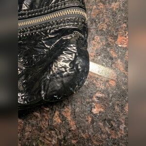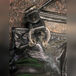 Vintage, pre-loved Via Spiga black patent leather purse (see pics for minor signs of wear). Exterior pockets not only add a flashy styling element but are also functional (they unzip into shallow/narrow pockets). Interior zipper pocket along with two pockets perfect for a cell phone or keys. Magnetic button closure.