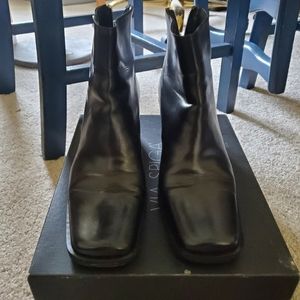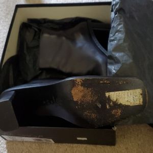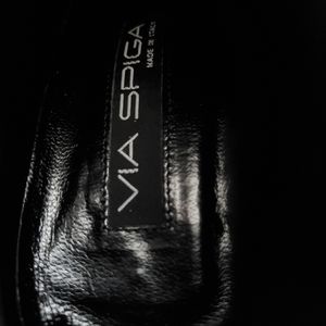 Black leather, Grafton Kerala Calf, Via Spiga ankle boot. 6.5 USA. Great for a night out. Only worn a few times. Stayed in box in an air-conditioned closet. Insole has no visible wear and tear. Sole of shoe has some wear on toe box area.