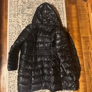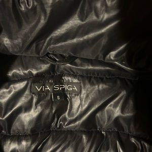 Black Via Spiga packable down coat with hood.