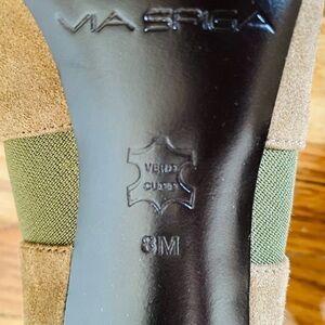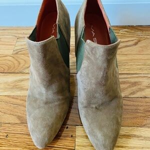 Via Spiga taupe suede ankle bootie with green fabric detail. 4.5 “ heel. Size 8.