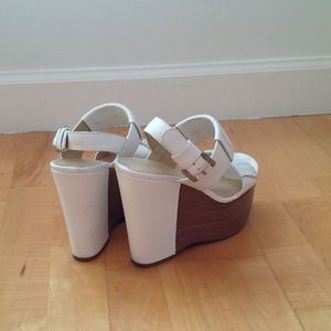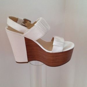 Beautiful Via Spiga white leather platforms sandals in size 7, heel is 5 inches high and front platform is 2 inches high. Silver buckle on the side and brown cognac platform. Used twice !