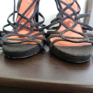 Beautiful Via Spiga promise black glittery strappy heels size 10. Leather. Stiletto measures approximately 5.25" high. Ajustable buckle closure. Gently worn. Cool tangerine sole.