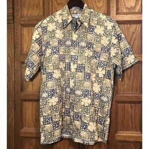 Via Veneto Men's M Hawaiian Shirt Short Sleeve Button Up Blue & Tan Cotton Korea