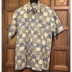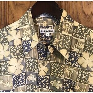 Vintage, Via Veneto, Men's size Medium, Hawaiian Shirt. Short Sleeve, Button Up, Blue & Tan, 100% Cotton Camp Shirt. Made in Korea.
