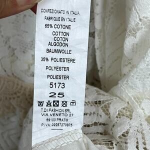 The Via Veneto 27 Vintage Women's Dress is a beautiful midi dress in ivory with a floral pattern, V-neckline, and flared sleeves. Made from a cotton blend material with a lace fabric type, this dress features a pullover closure and is machine washable. Perfect for occasions like weddings, parties, or casual wear, this fit & flare style dress exudes a retro 70s and 80s vibe with its lined design and Italian craftsmanship. The elegant and timeless design of this dress makes it a standout piece for any woman's wardrobe.