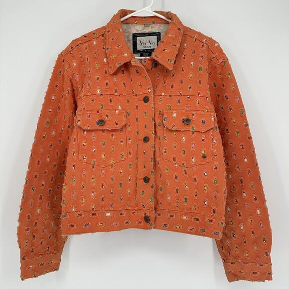 Via Via Couture Denim Jacket XL Orange Trucker Embroidered Textured Boho Retro
