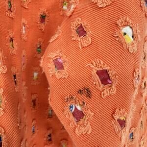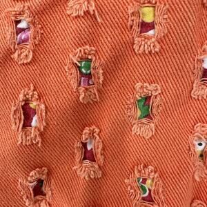 Color/Pattern: Orange (rust/terracotta) with allover tufted/frayed cutout details revealing multicolor floral fabric underneath