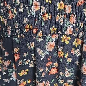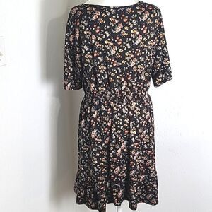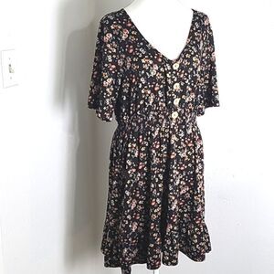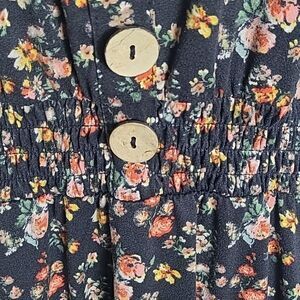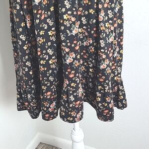 * Black floral dress, orange & yellow flowers, 4" ruffled hem, short sleeves, 4 large buttons in front, shirred elastic waistband, scoop neckline