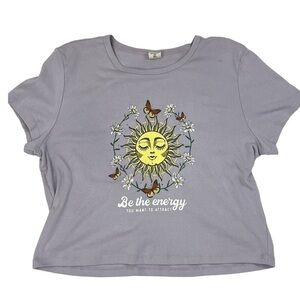 Vibe N' New T-Shirt lavender color w sun and butterfly/floral design and says, “ be the energy you want to attract“