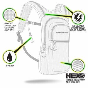 2.0 Liter BPA Free, Antimicrobial Water Bladder Included.