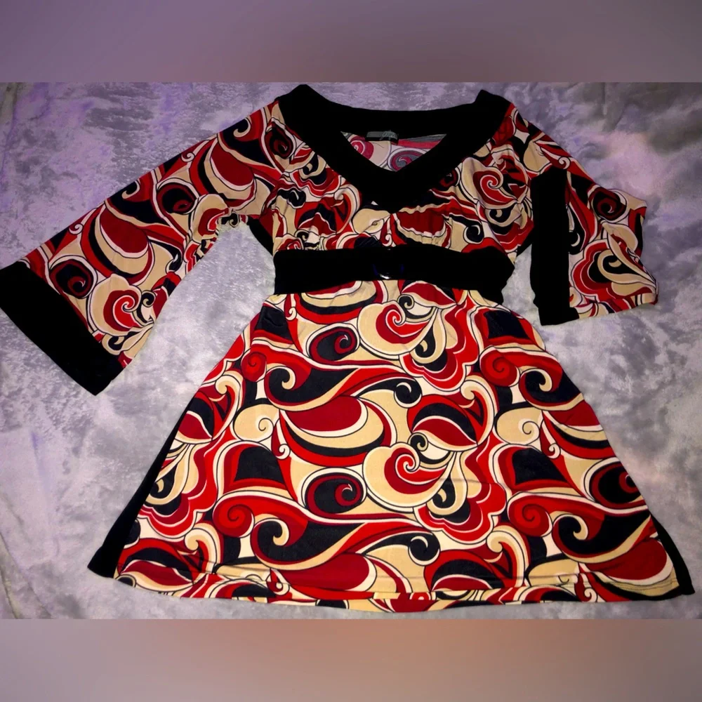 Gorgeous Pop of Red, black, cream & white swirls in this waist clenching blouse! I love the flowie arm sleeves🖤