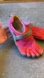 Bright pink and orange toe shoes by Vibram. Adjustable straps for comfort.