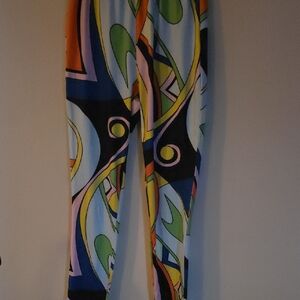 Eye-catching button-up shirt and pull on pants , with a bold abstract pattern. Features a mix of green, blue, pink, and orange colors.