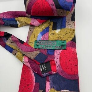 Make a statement with this vibrant abstract tie, featuring bold red, blue, and gold colors. Perfect for adding a touch of sophistication to any outfit.