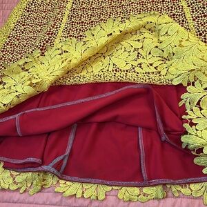 Turn heads in this stunning handcrafted African two-piece outfit, featuring a vibrant yellow and red color palette with intricate floral lace detailing. The fitted peplum top has elegant off-shoulder sleeves adorned with bold floral appliqué, while the matching maxi skirt hugs the hips and flares gently with a flattering silhouette.