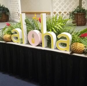 Brighten your space with this vibrant 'Aloha' sign featuring a playful pineapple design. The cheerful blend of white and yellow adds a tropical touch to any decor. Made out of welded aluminum. Letters were hand-shapen. Back of letters are hollow and can accommodate lighting if so choose. Paint is not perfect but "rustic". In the first photo, the letters are anchored to shelf using wood screws.