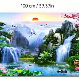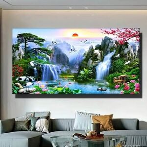 Immerse yourself in tranquility with this vibrant Asian-inspired landscape canvas art. This breathtaking piece features lush waterfalls, a serene lotus pond with koi fish, majestic mountains, and cranes soaring under a golden sunset. It's designed to bring harmony and a sense of peaceful natural beauty to your living room, bedroom, or office, embodying the principles of Feng Shui.