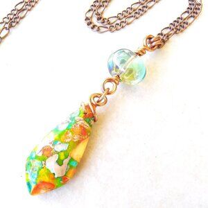 This gorgeously colored Sea Sediment Jasper Composite teardrop is topped by a chubby oval Glass Bead which has been enriched with an Aurora Borealis Color Wash, that makes it shimmer and sparkle in the right light, drawing the eye to this beautiful ensemble. I kept the wire wrapping aspect very minimum - just enough to securely pull the two pieces together and to create a sturdy bail. The copper figaro chain has been hardwired to the bail, and the entire necklace is right at 21". If you need a bit of a longer extender added, please ask me before you purchase this! Size adjustments are always free of charge with a full price purchase!