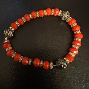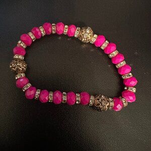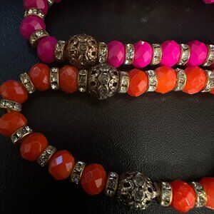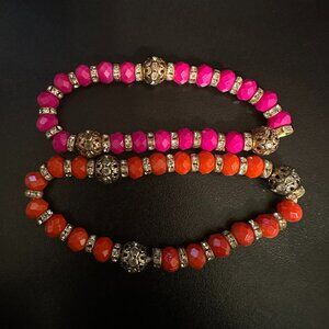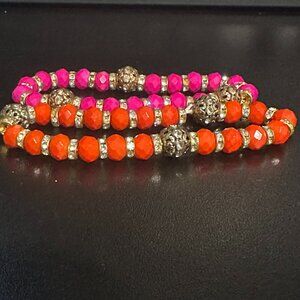 Add a pop of color to your wrist with this stunning set of 2 stretch bracelets. Featuring vibrant faceted beads in hot pink and bold orange, each bracelet is accented with intricate gold-tone spacer beads and rhinestone-studded separators for a touch of sparkle. The stretch design ensures a comfortable fit for various wrist sizes.