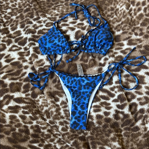 Stylish blue leopard print bikini set. Features adjustable ties for a perfect fit. This is so so cute I accidentally had ordered 2 ๐ This is brand new bright blue adorable high waisted bottoms size is x- small does have removable padding for the top . I would also say it does run a little big .
