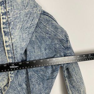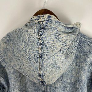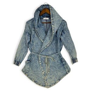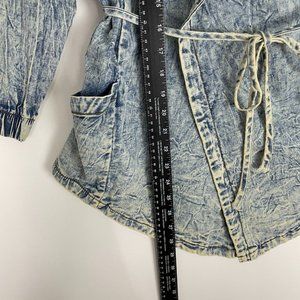 Stylish denim jacket with a unique wrap design. Features a tie waist and long sleeves. Perfect for casual wear.