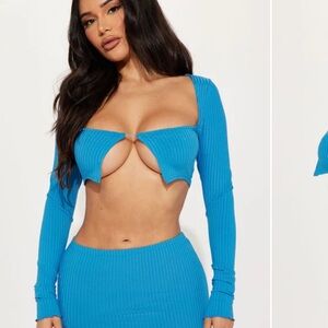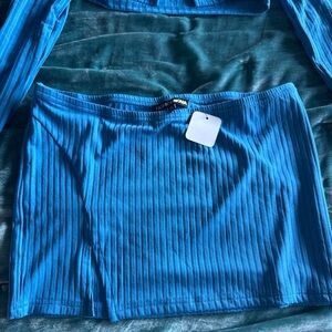 Stylish blue ribbed two-piece set. Features a unique top design with long sleeves. Perfect for a bold look.