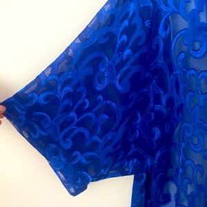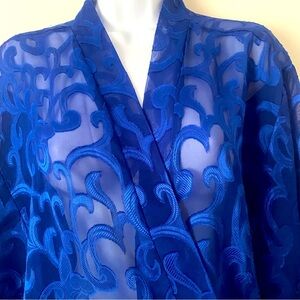 Elegant sheer kimono in a vibrant blue with intricate embroider style patterns. Perfect for layering.