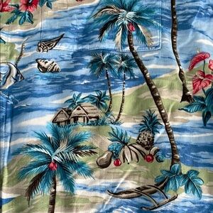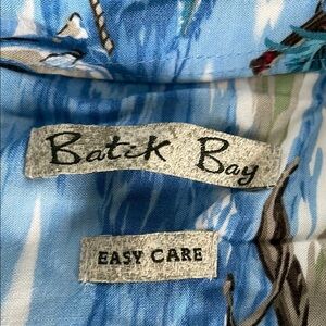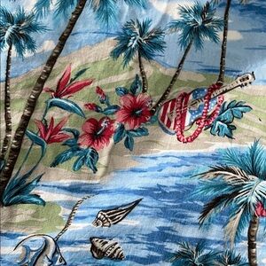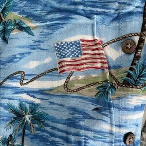 This casual button-down shirt showcases a lively tropical print in blue and green hues, perfect for a laid-back summer vibe. 4th of July. American Flags beach vibes.Its lightweight fabric ensures comfort in warm weather, while the eye-catching design brings a touch of island flair.