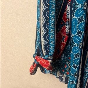 This tunic showcases a lively blend of blue and red hues with intricate patterns, featuring a smocked neckline and relaxed 3/4 sleeves. The lightweight fabric ensures a comfortable and stylish fit, perfect for casual occasions.