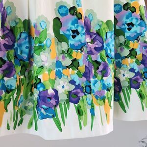 This mini A-line skirt showcases a stunning blend of blue and green hues in a pleated design, ideal for cocktail events. The abstract garden-like pattern adds a touch of elegance to the flowing fabric, while the clean hemline and plain waistband offer a sophisticated contrast.